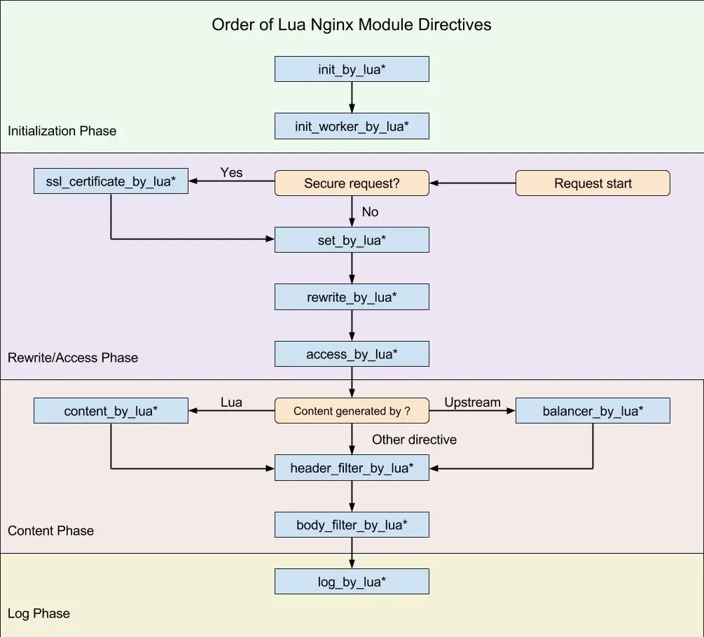 init_by_lua http set_by_lua server, server if, location, location if rewrite_by_lua http, server, location, location if access_by_lua http, server, location, location if content_by_lua location, location if header_filter_by_lua http, server, location, location if body_filter_by_lua http, server, location, location if log_by_lua http, server, location, location if
